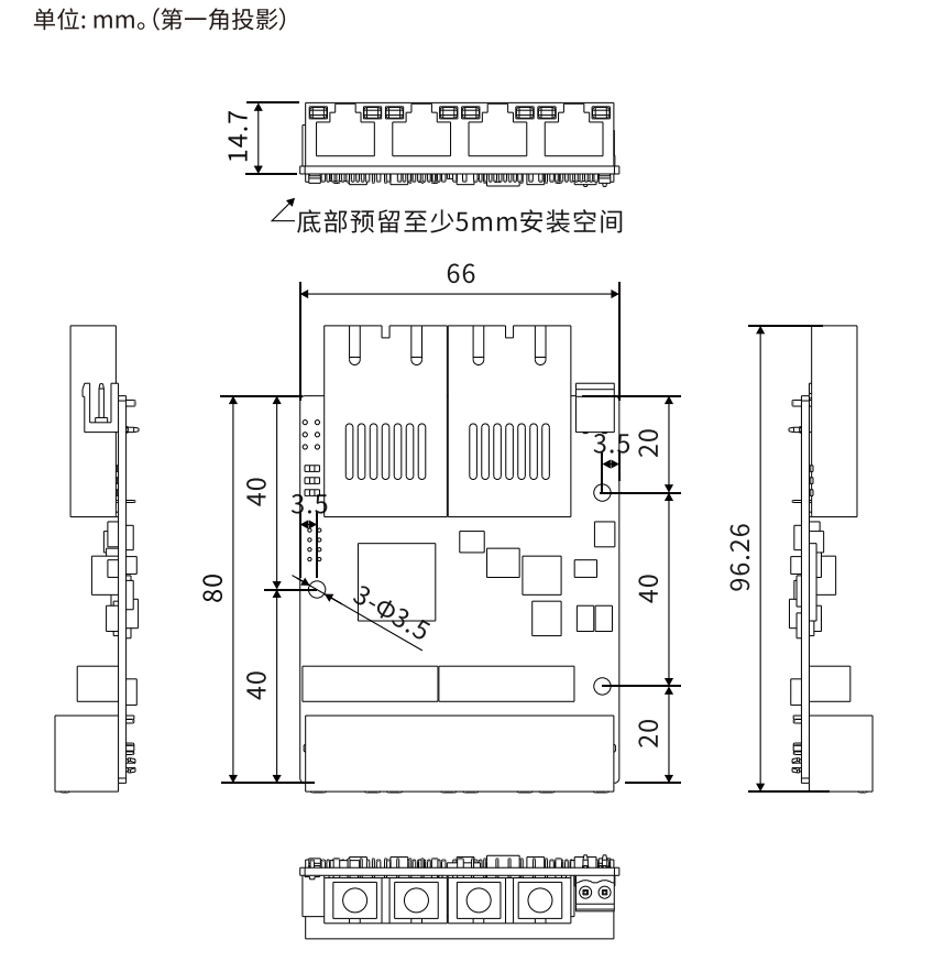 安装方式:嵌入式安装 散热方式:自然冷却,无风扇 外形尺寸::80×66×14.7(mm)(不含连接器尺寸) |